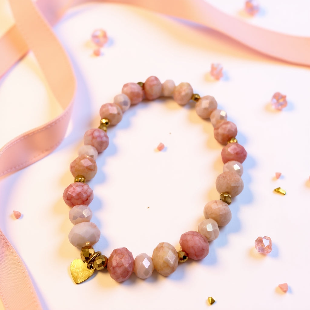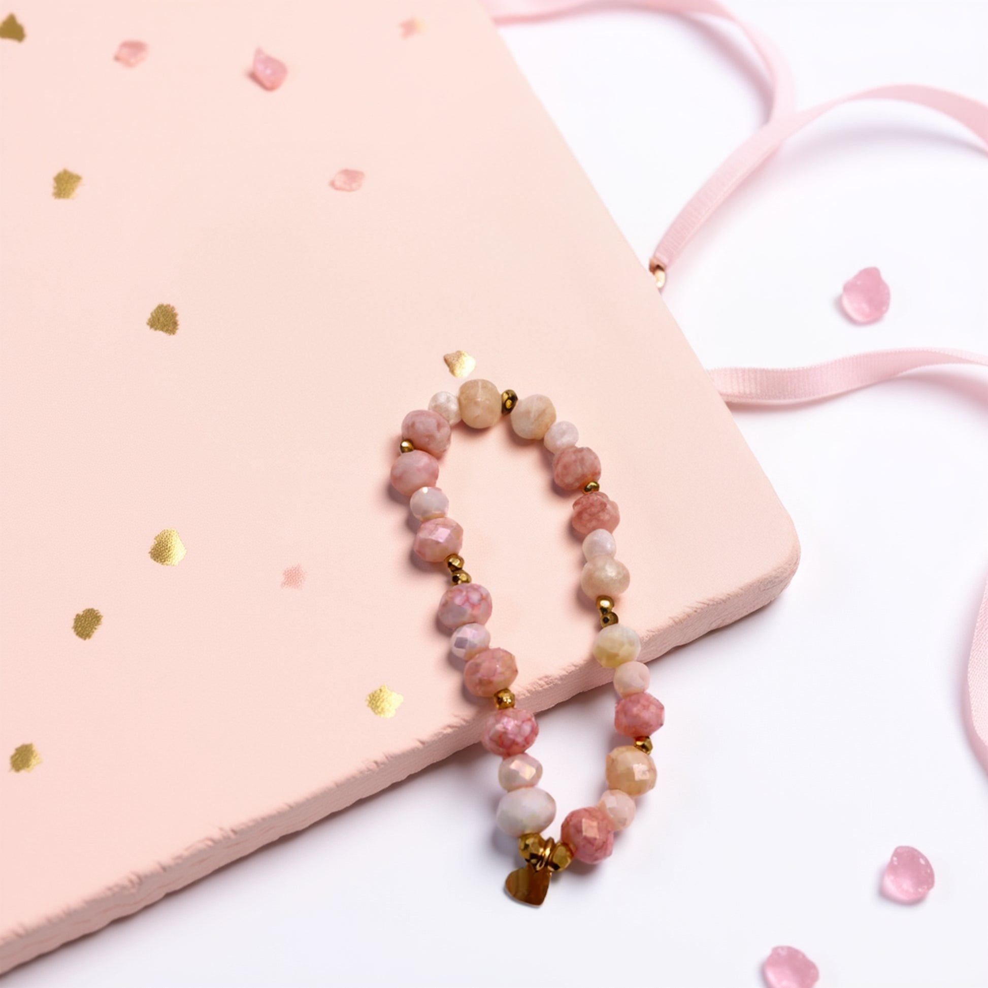 Jeśli szukasz delikatnej i kobiecej ozdoby, która subtelnie podkreśli Twój styl – ta różowa bransoletka z serduszkiem będzie idealnym wyborem. Ręcznie wykonana z fasetowanych szklanych oponkek w odcieniach różu i ecru oraz złotych kulek hematytu, tworzy pełną blasku kompozycję, która przyciąga spojrzenia i dodaje romantycznego uroku każdej stylizacji.