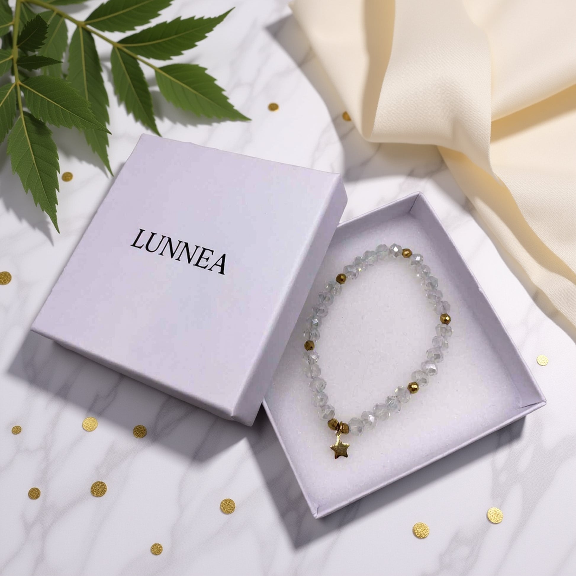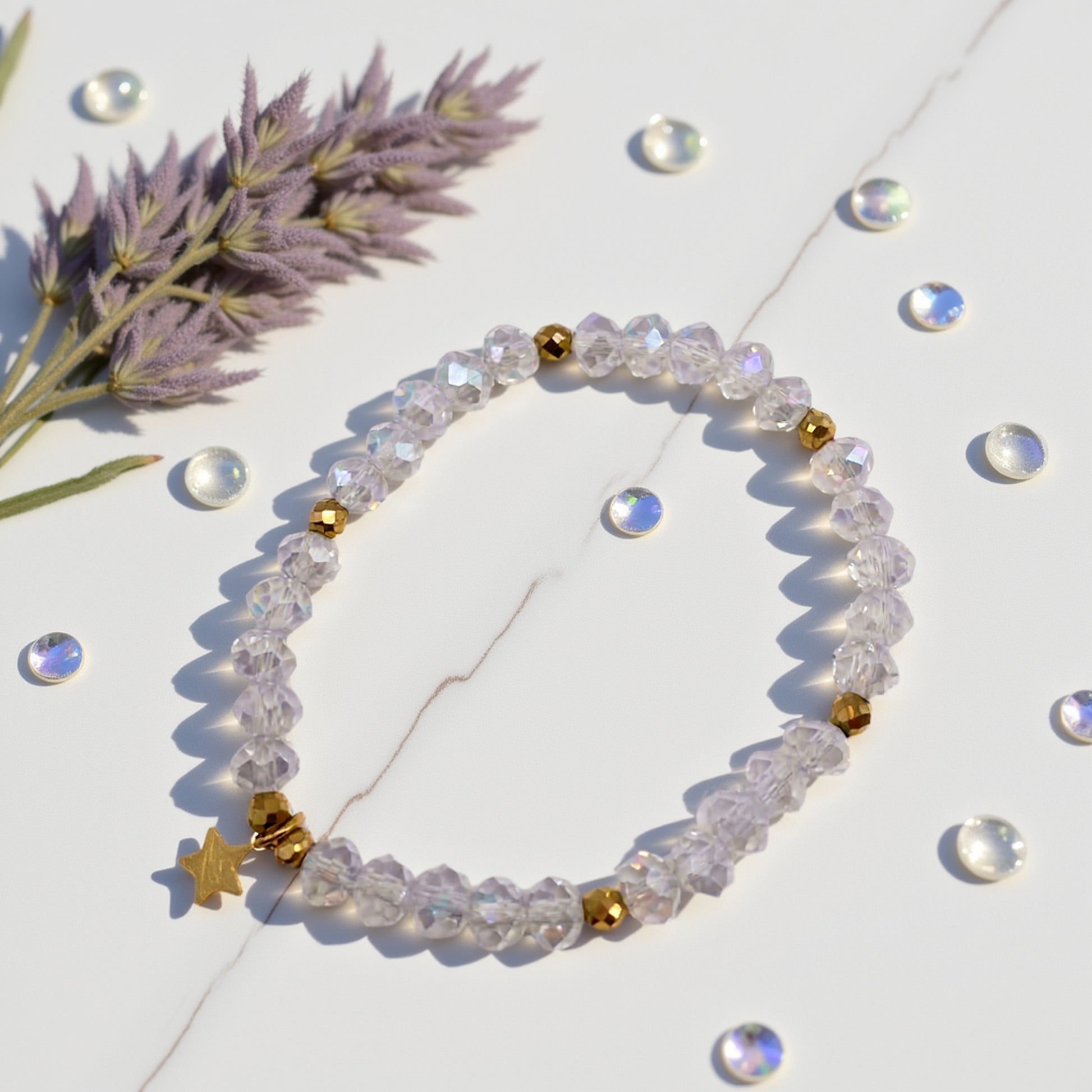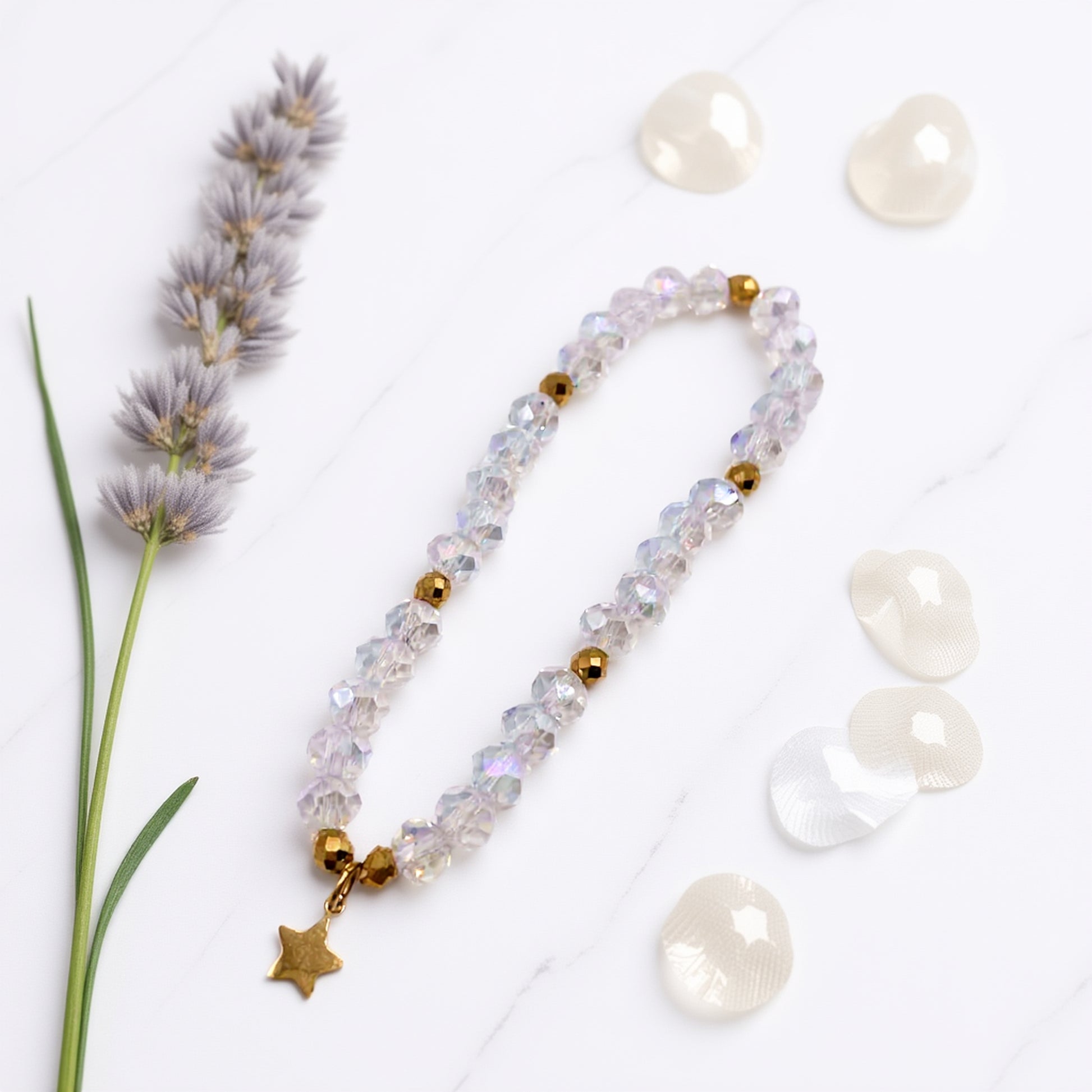 Delikatna, ręcznie robiona bransoletka z kryształków to doskonały wybór dla miłośniczek subtelnej biżuterii handmade. Transparentne fasetowane koraliki pięknie odbijają światło, tworząc efekt migotania przy każdym ruchu ręki. Złote akcenty w postaci hematytowych kulek oraz zawieszka w kształcie gwiazdy dodają elegancji i sprawiają, że ta bransoletka świetnie sprawdzi się jako prezent - zarówno dla przyjaciółki, siostry, jak i na wyjątkową okazję, taką jak urodziny, rocznica czy święta.
