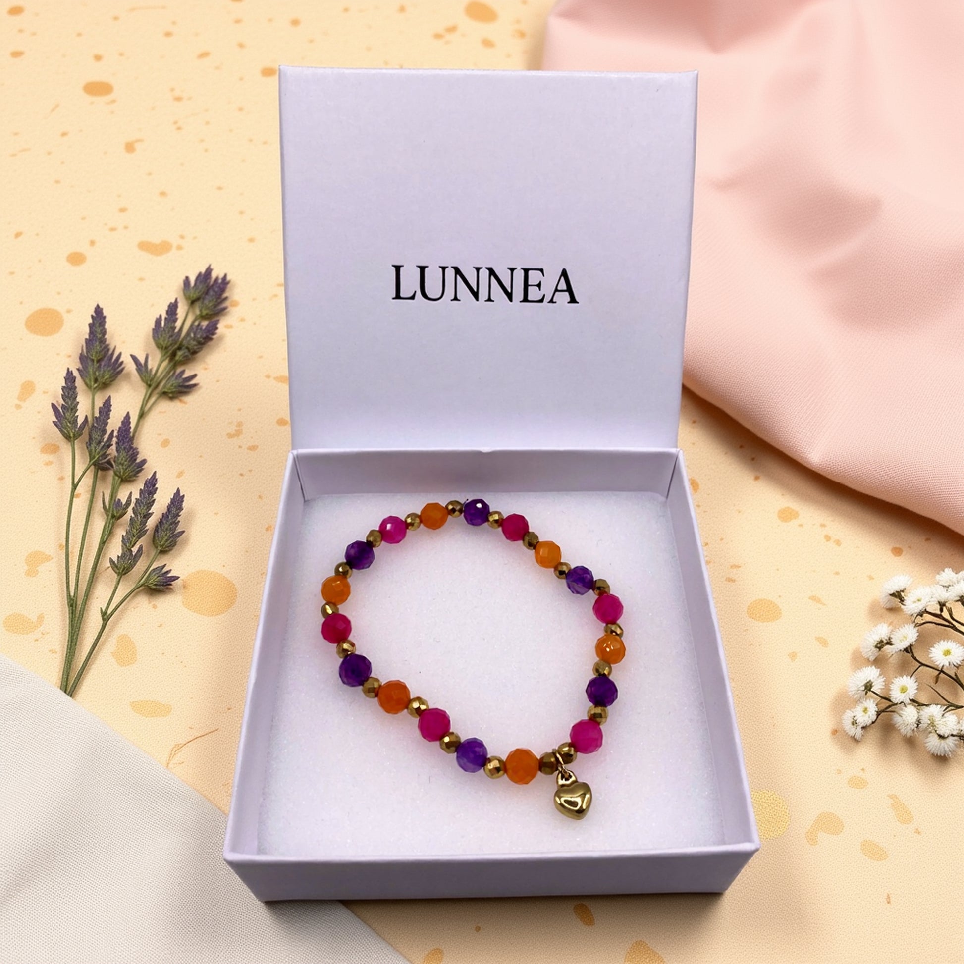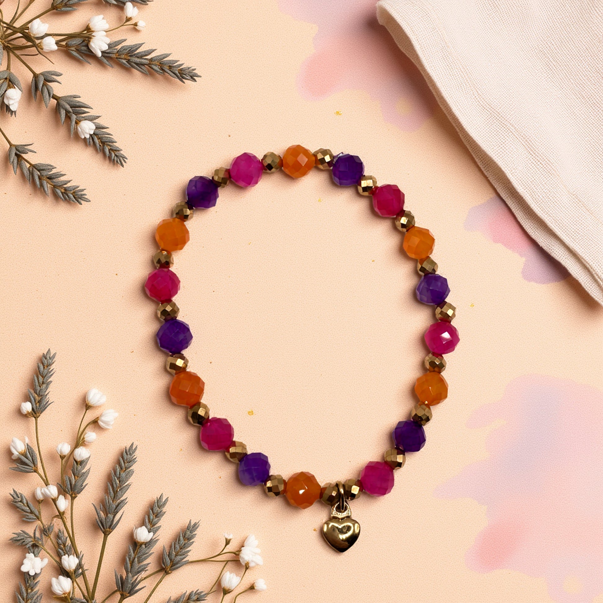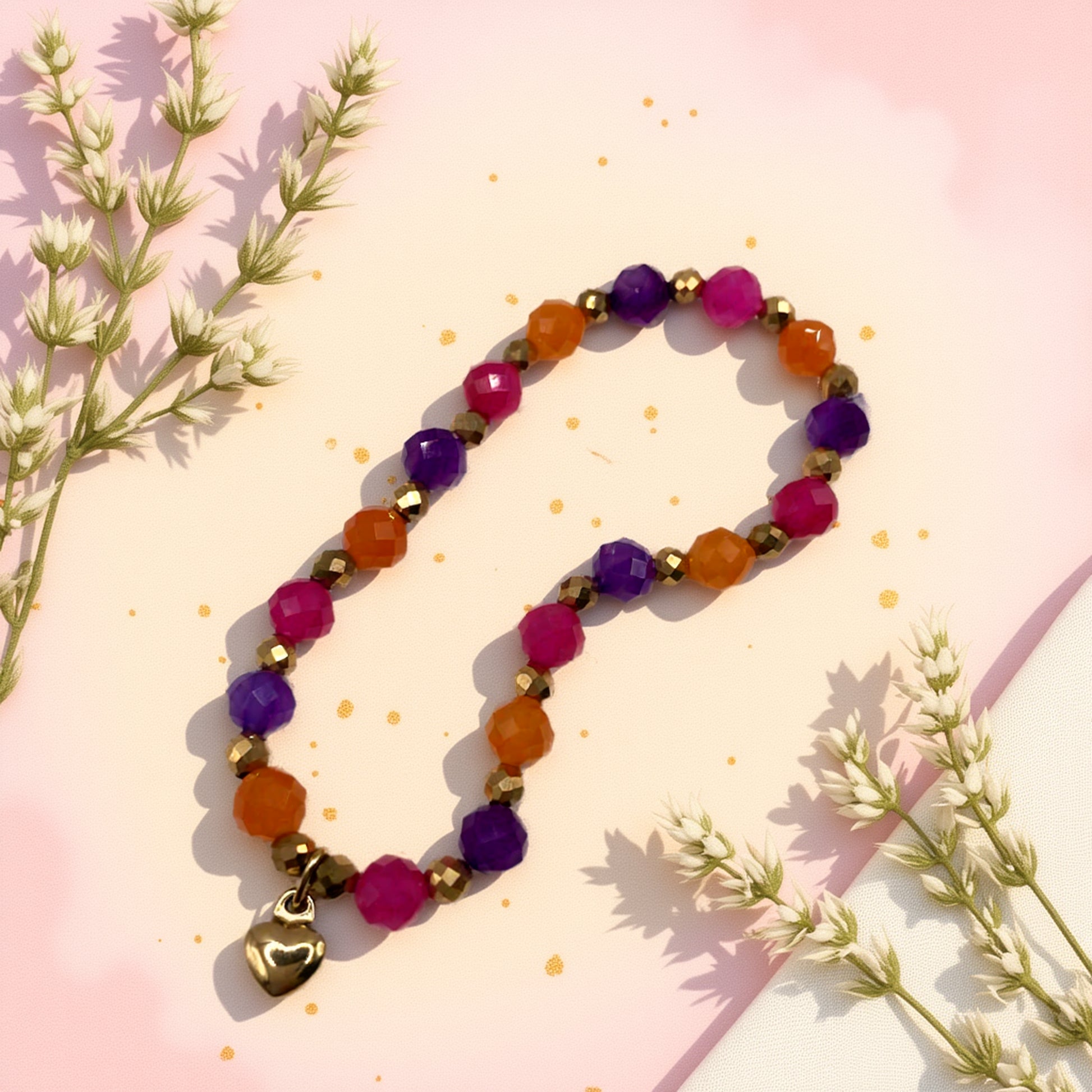 Szukasz wyjątkowego dodatku, który ożywi każdą stylizację? Ta ręcznie robiona bransoletka z kamieni naturalnych zachwyca intensywną kolorystyką i pięknym wykończeniem. Różowe, pomarańczowe i fioletowe agaty brazylijskie tworzą harmonijną kompozycję z błyszczącym hematytem oraz złotą zawieszką w kształcie serca. To nie tylko kolorowa bransoletka z agatów - to energetyczna, unikatowa biżuteria handmade, która przyciąga spojrzenia i dodaje pewności siebie.