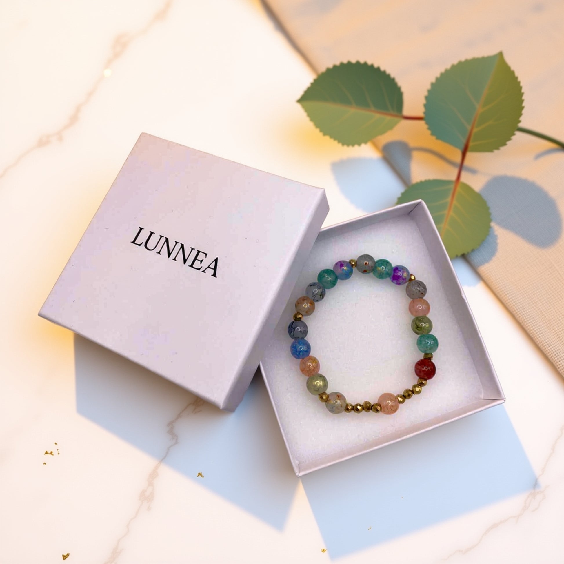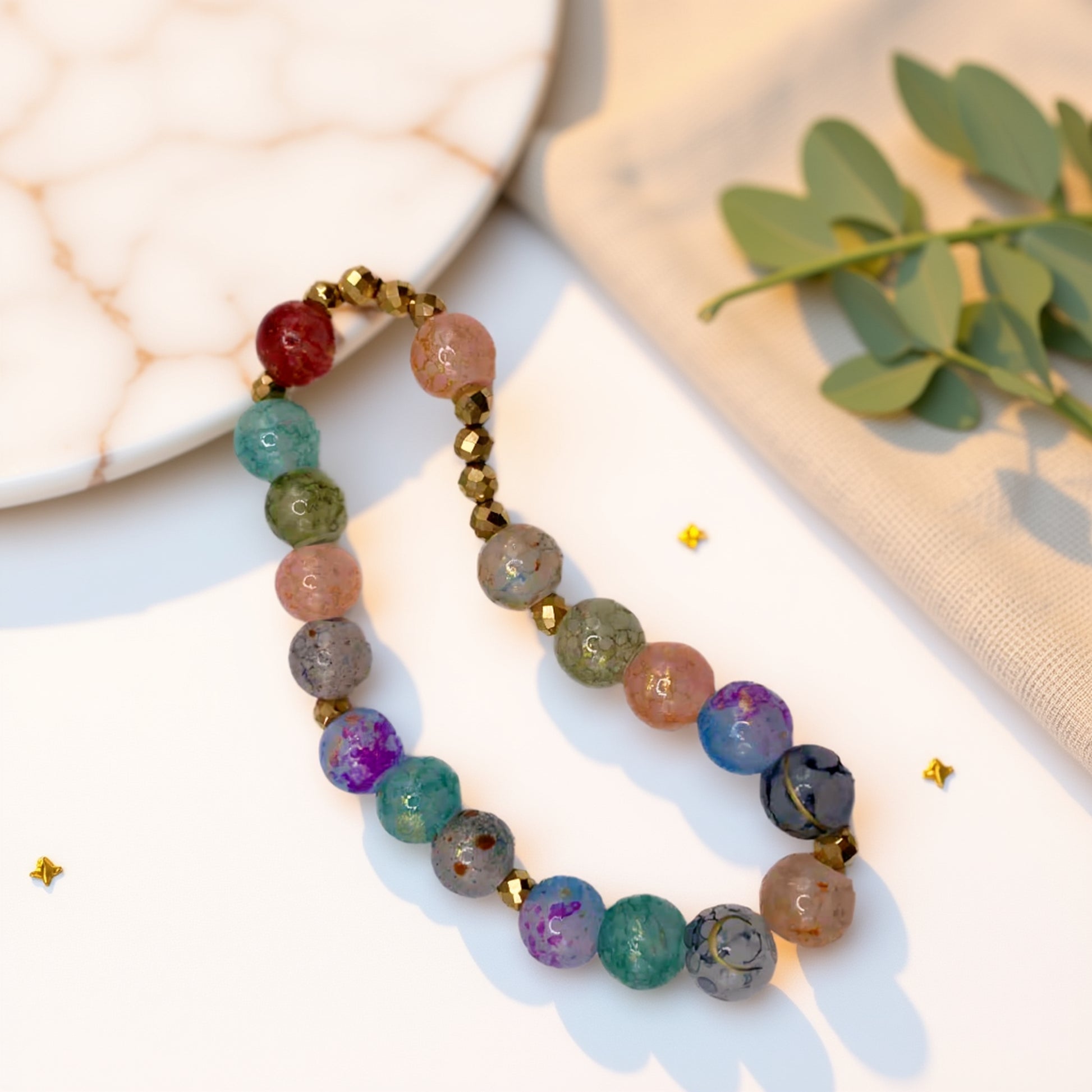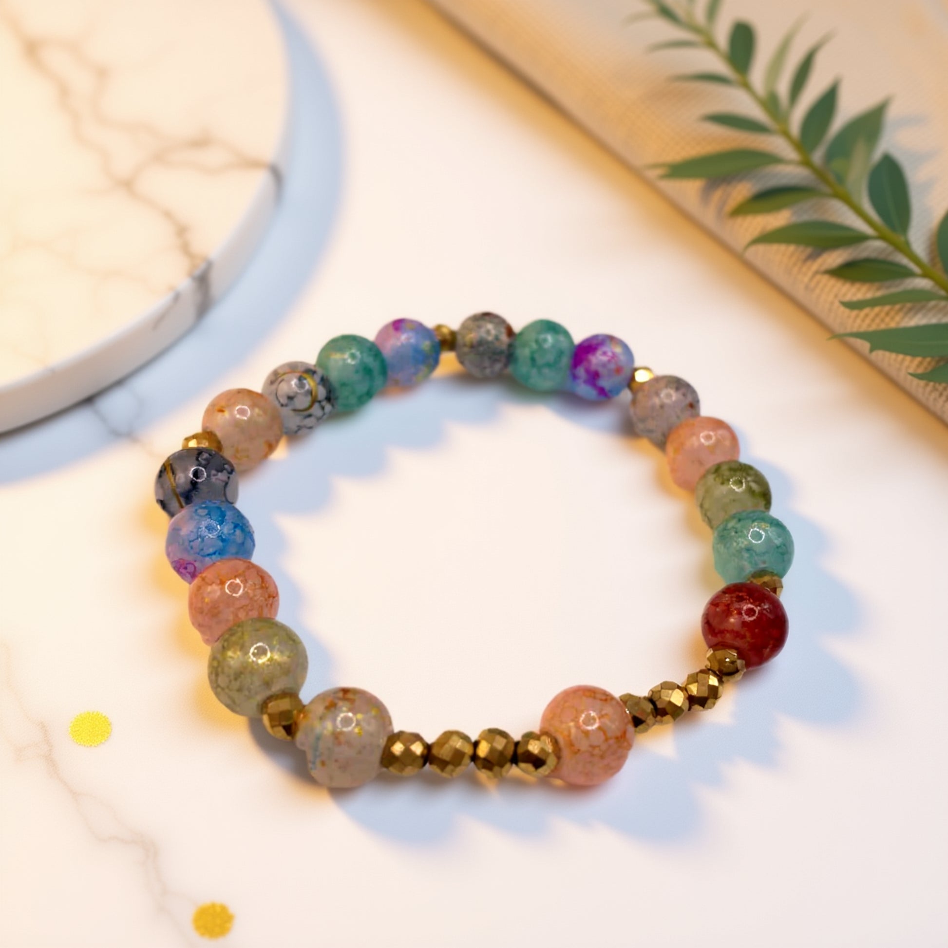 Ta bransoletka z kolorowego szkła i hematytu to kwintesencja radości, lekkości i kobiecego uroku zamknięta w jednym dodatku. Stworzona z myślą o kobietach, które lubią wyrażać siebie przez biżuterię - pełną barw, ręcznie wykonaną i niepowtarzalną. Wielokolorowe szklane koraliki przyciągają wzrok subtelnym połyskiem i unikalnym wzorem, a fasetowany złoty hematyt dodaje jej elegancji i stylu. To doskonały wybór na prezent - zarówno dla przyjaciółki, siostry, jak i samej siebie.