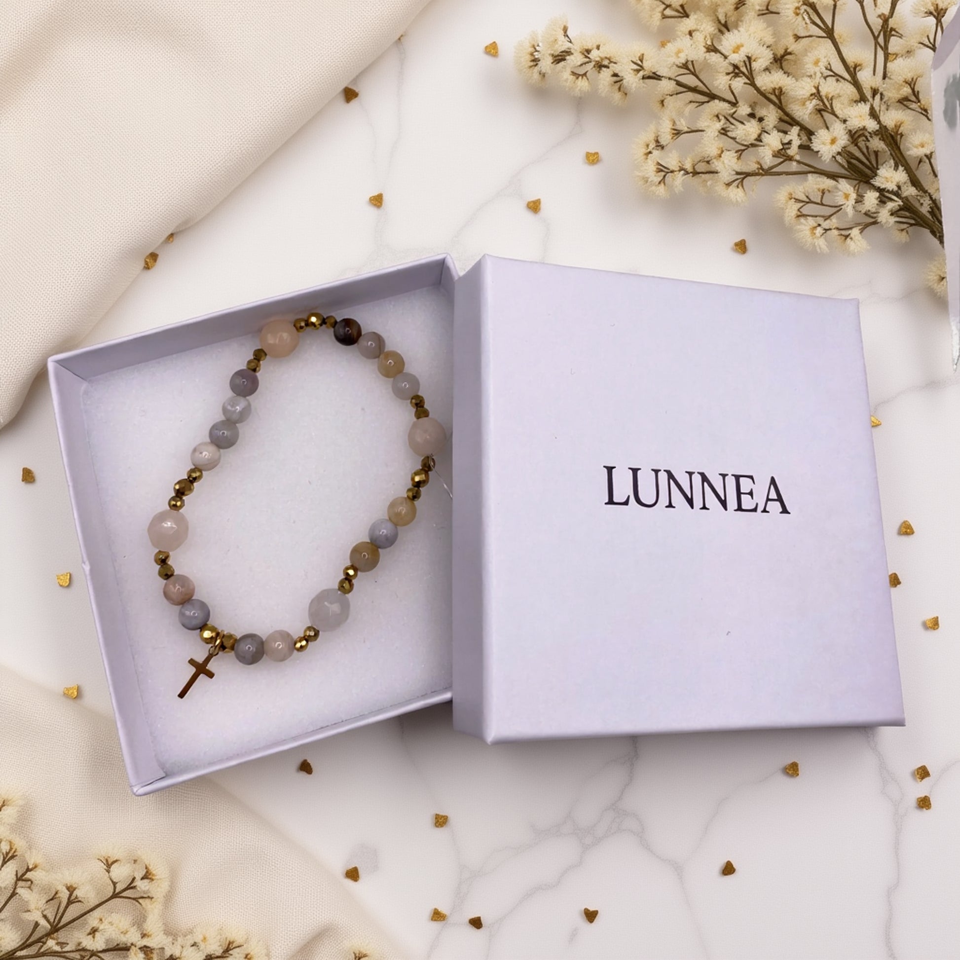 Naturalne kamienie w pastelowej palecie kolorów wprowadzają poczucie spokoju i harmonii. Bransoletka emanuje kobiecą siłą – łagodną, ale stanowczą.