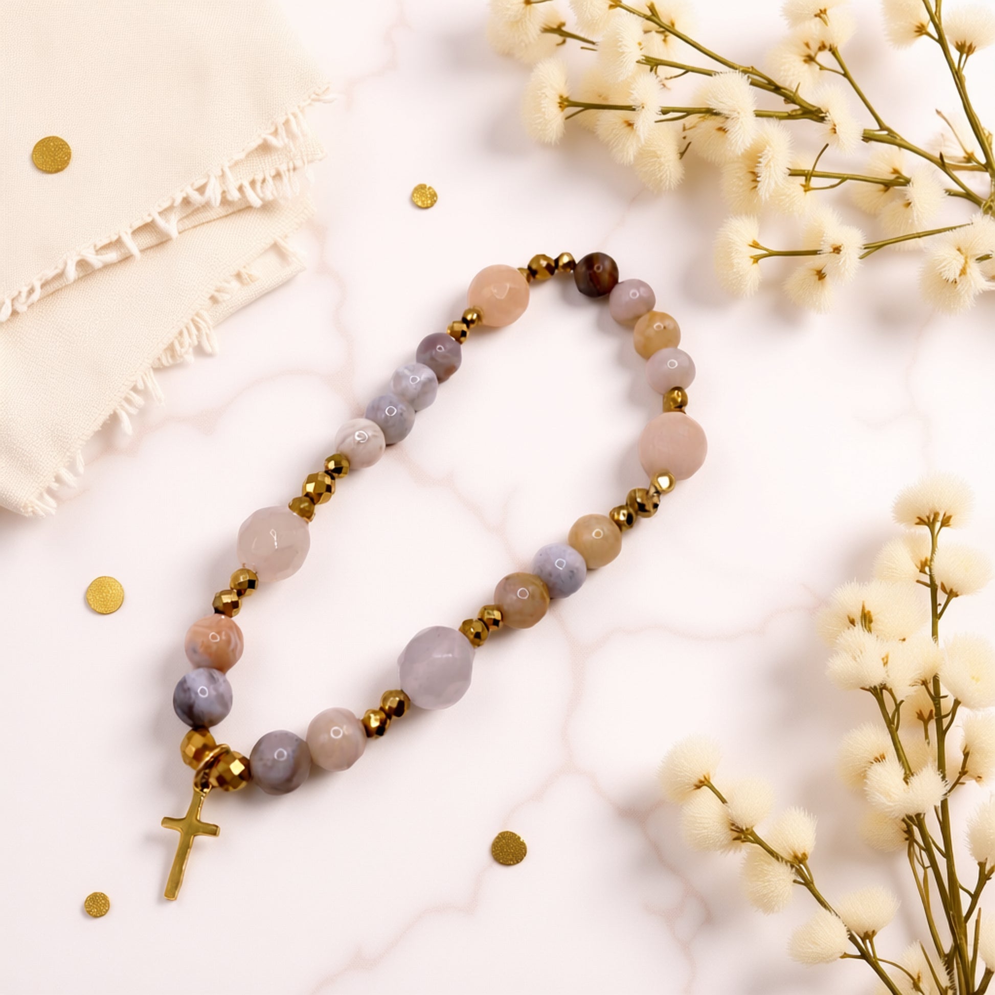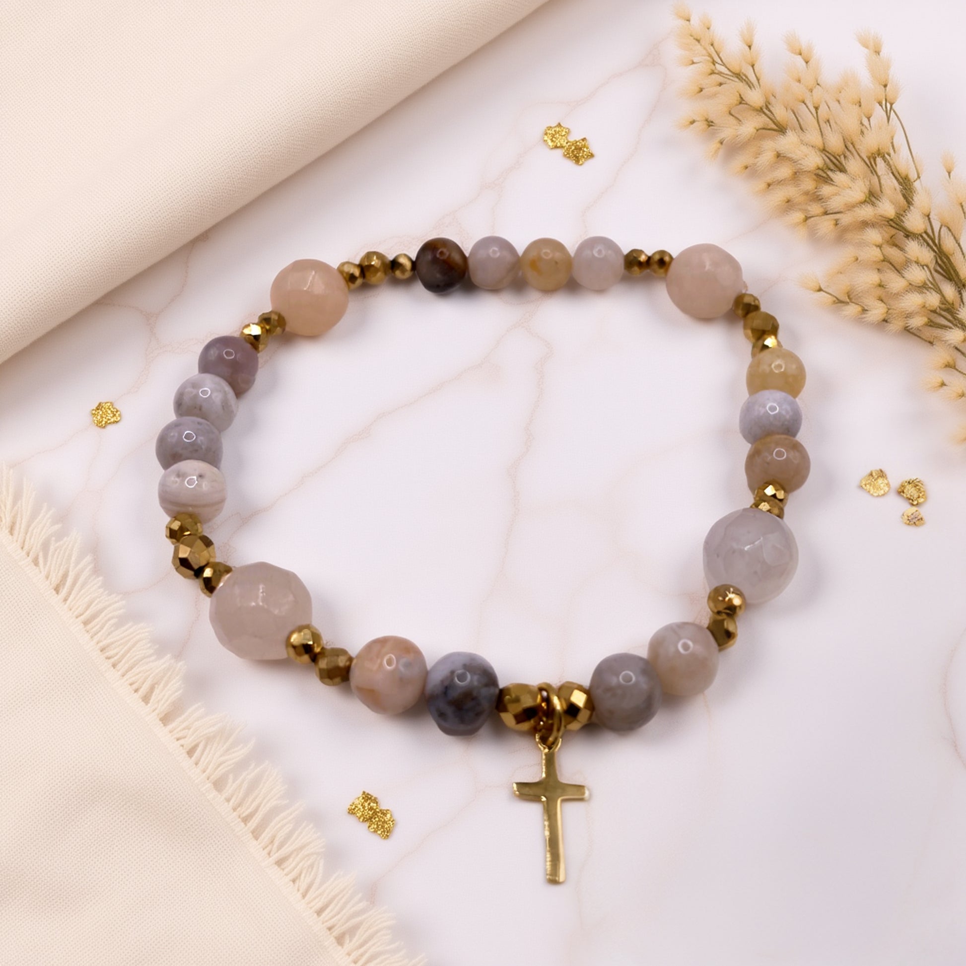 Bransoletka łączy w sobie duchowy charakter i nowoczesną estetykę. Różowo-brzoskwiniowy awenturyn wnosi łagodność i kobiecość, agat – wewnętrzną harmonię, a krzyżyk – ponadczasowy symbol wiary i siły. To biżuteria handmade, która ma nie tylko zdobić, ale też przypominać o tym, co naprawdę ważne.