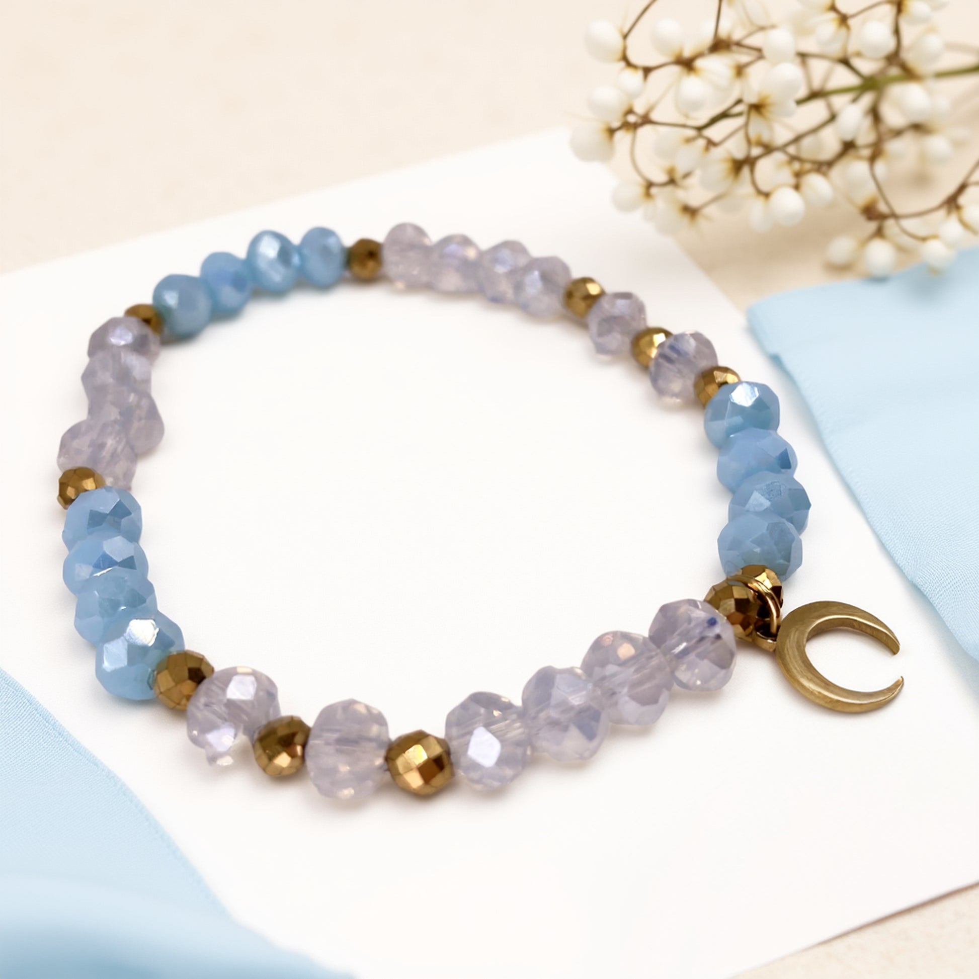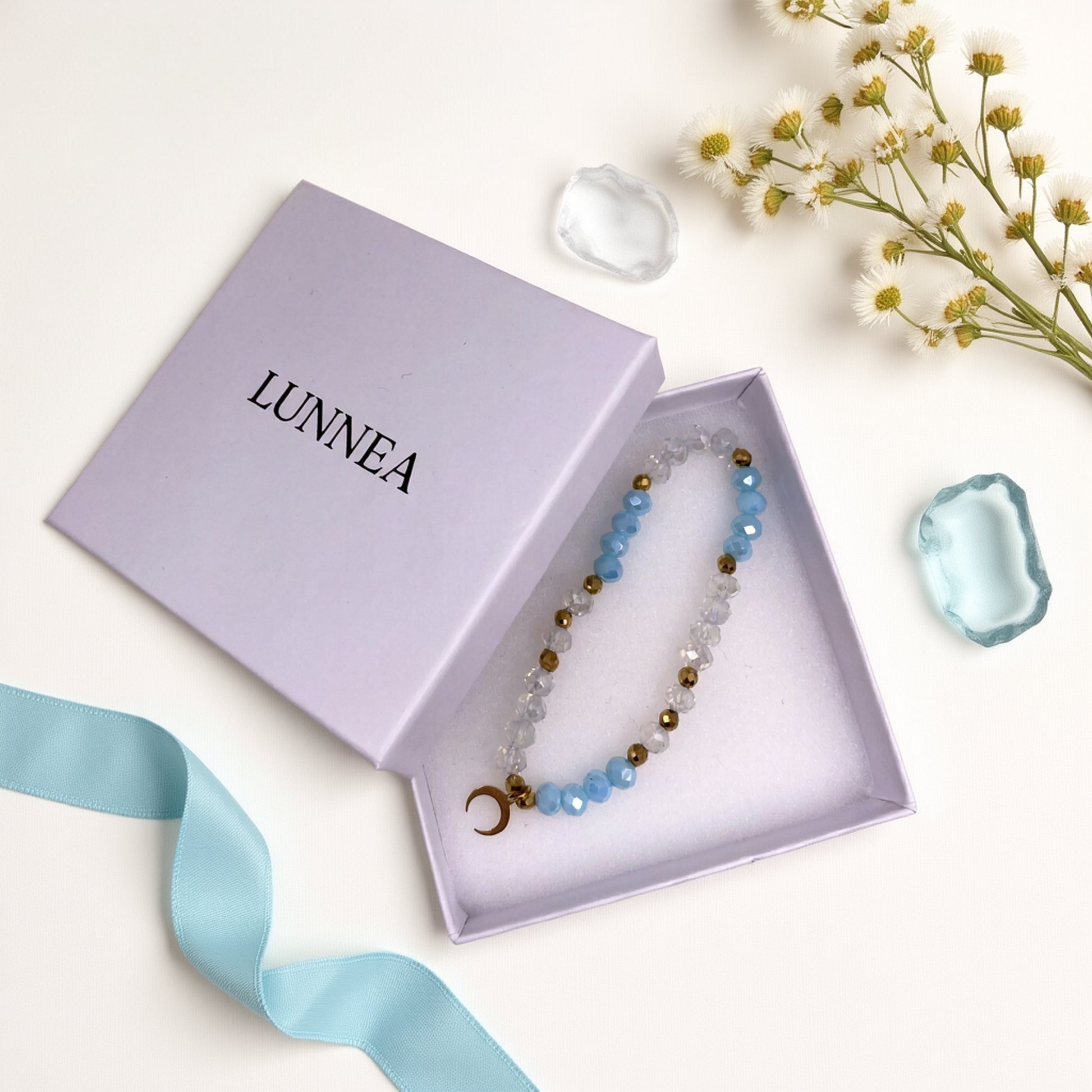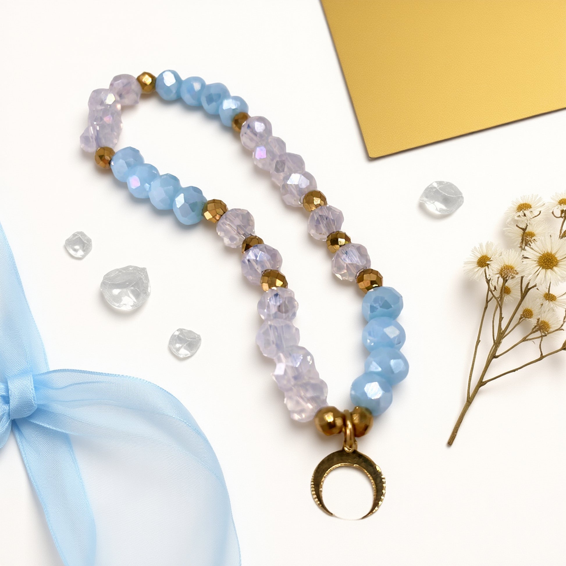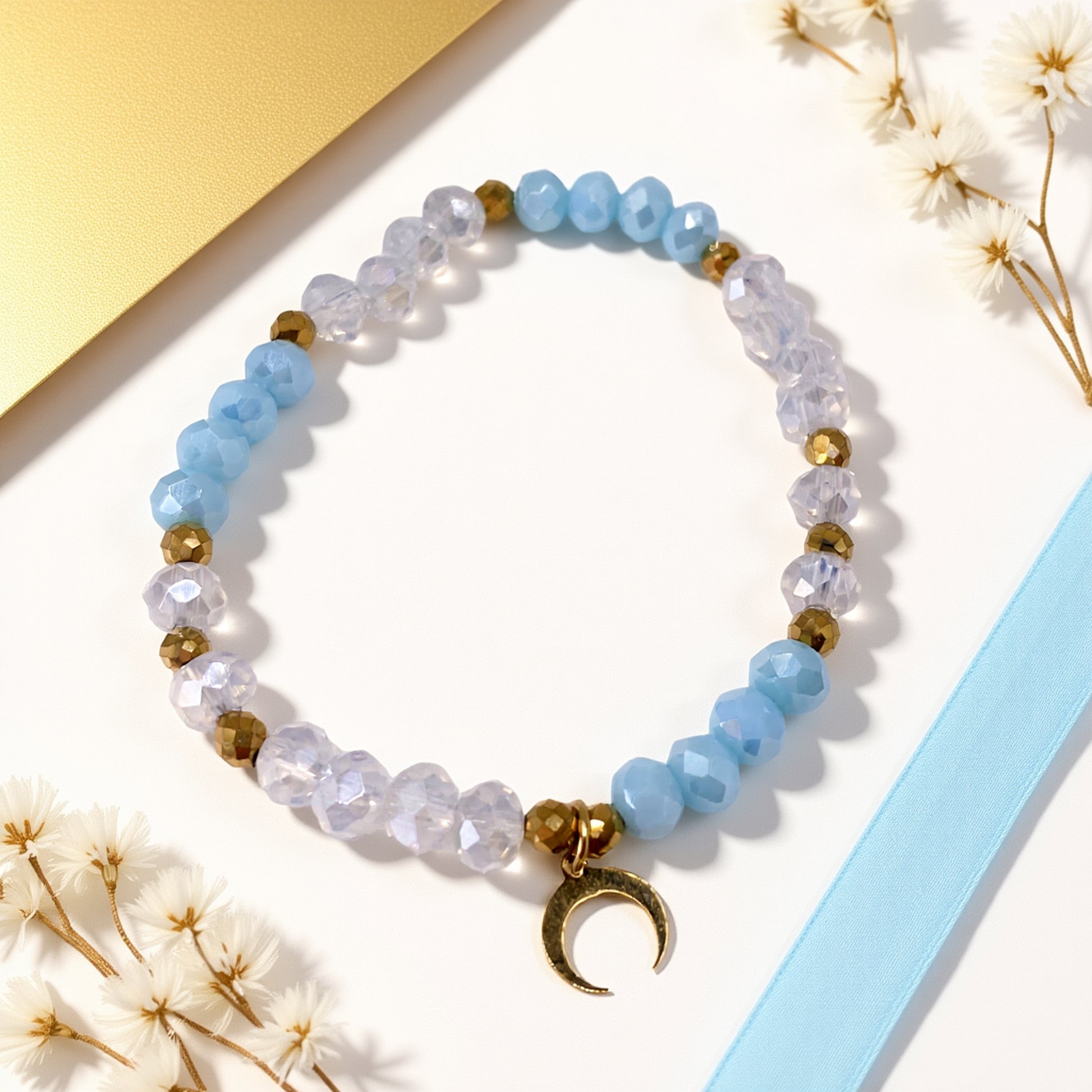 Ta ręcznie robiona bransoletka z księżycem przywołuje skojarzenia z nocnym niebem, spokojem i kobiecą siłą. Idealna zarówno na co dzień, jak i na wyjątkowe okazje - od romantycznej kolacji, po urodzinowy prezent. Księżyc symbolizuje intuicję i wewnętrzną moc, a błękitne i transparentne kryształki delikatnie odbijają światło, dodając uroku. Noś ją jako osobisty talizman lub podaruj komuś bliskiemu - to biżuteria handmade, która niesie ze sobą emocje i znaczenie.