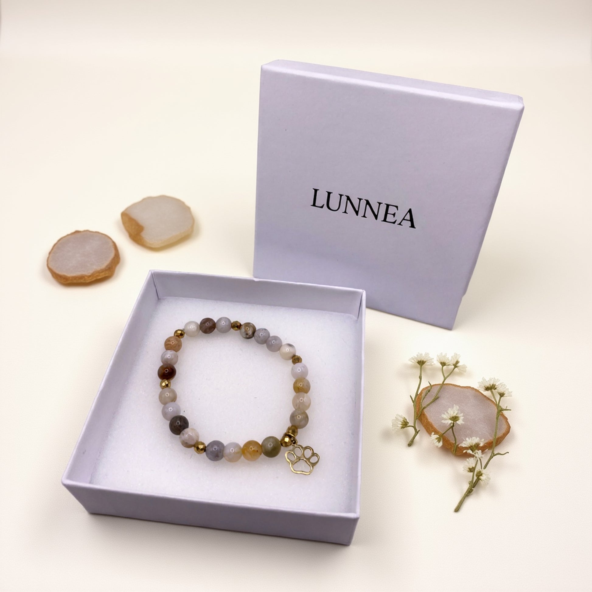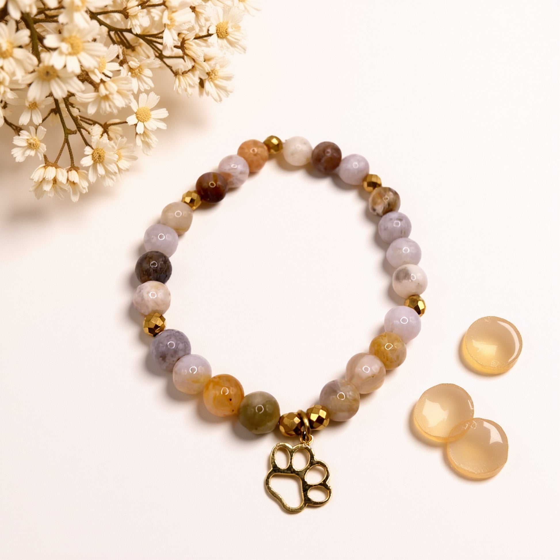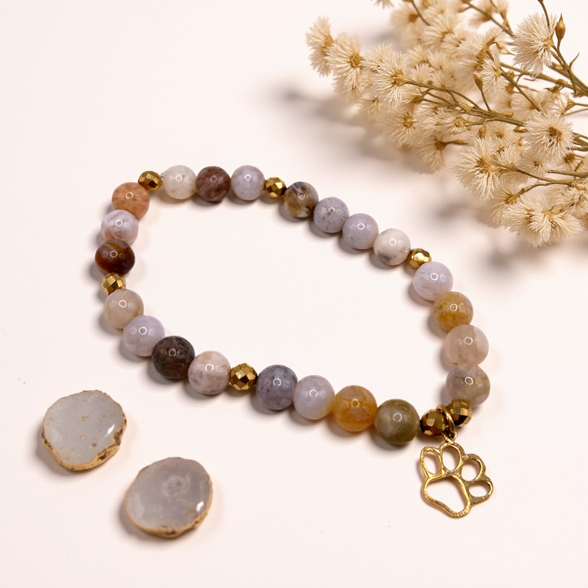 Jeśli szukasz wyjątkowego dodatku, który połączy miłość do natury z uczuciem do czworonogów, bransoletka damska z łapką psa z kamieni naturalnych będzie idealnym wyborem. Wykonana z gładkiego agatu bambusowego w ciepłych, ziemistych tonacjach i ozdobiona fasetowanym hematytem w złotym kolorze, zachwyca subtelnością i symboliką. Centralny punkt stanowi urocza zawieszka w kształcie psiej łapki, wykonana ze stali nierdzewnej. To biżuteria handmade z motywem psiej łapki, która nie tylko zdobi, ale też opowiada historię - o miłości, lojalności i trosce.
