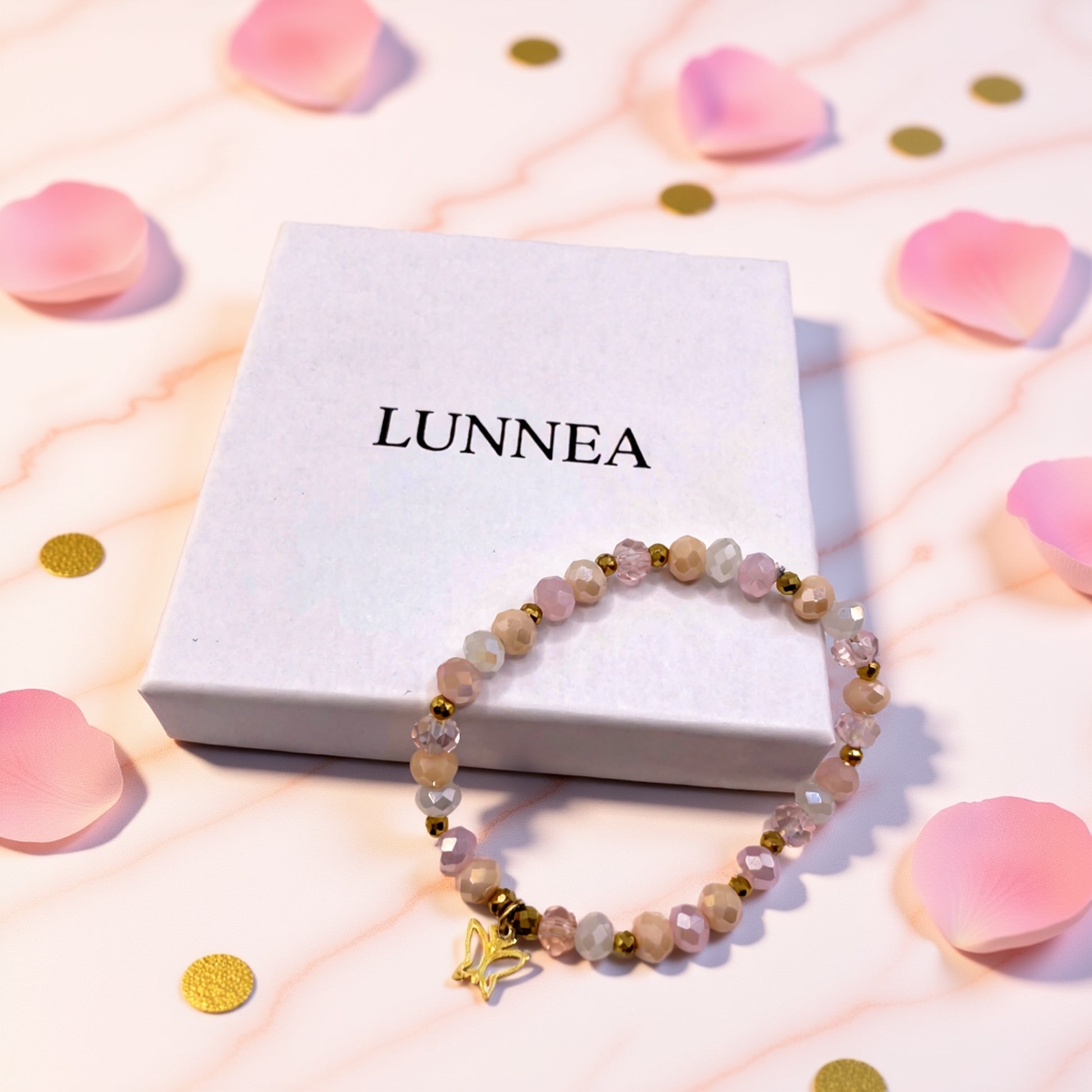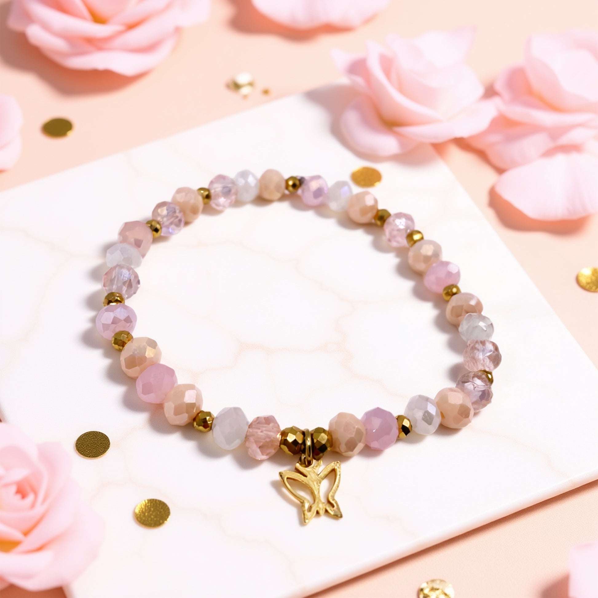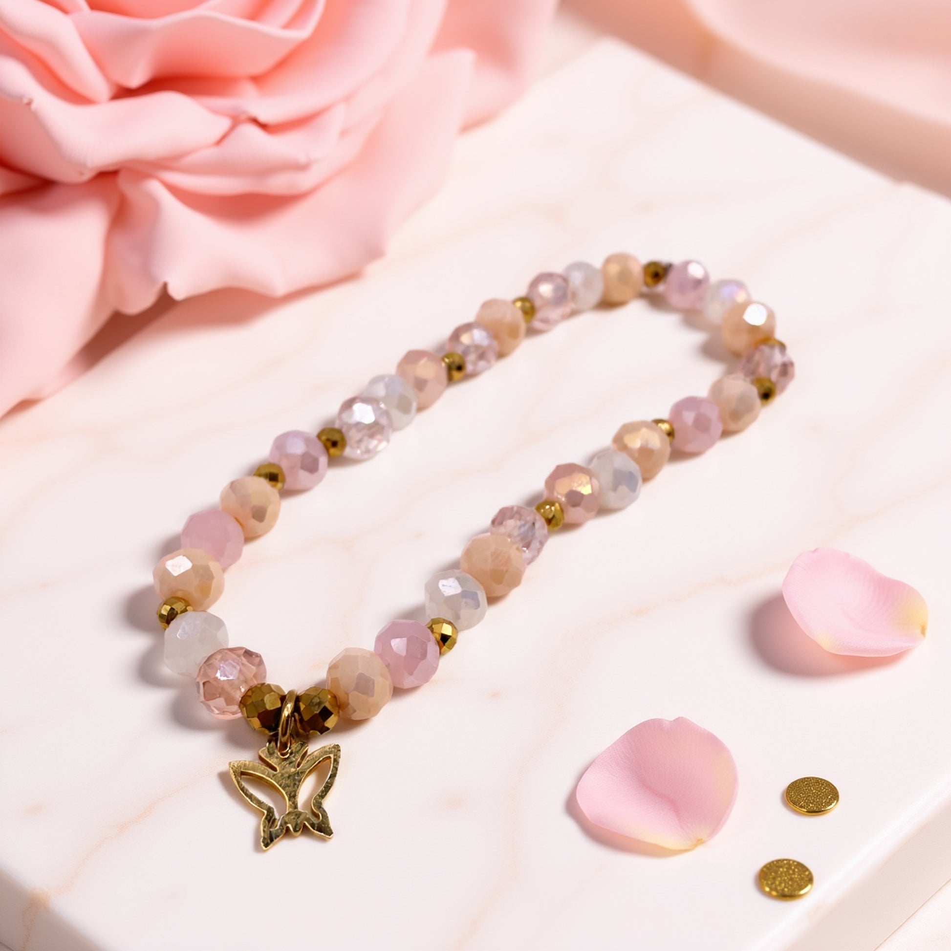 Jeśli szukasz subtelnej, kobiecej biżuterii handmade, która przyciąga spojrzenia i zachwyca detalem, ta bransoletka z fasetowanych oponek i zawieszką motylka będzie strzałem w dziesiątkę. Wykonana z mieniących się różowych szklanych koralików i złotych kulek z hematytu, doskonale sprawdzi się jako dodatek na co dzień oraz jako wyjątkowy prezent – na urodziny, imieniny czy bez okazji.