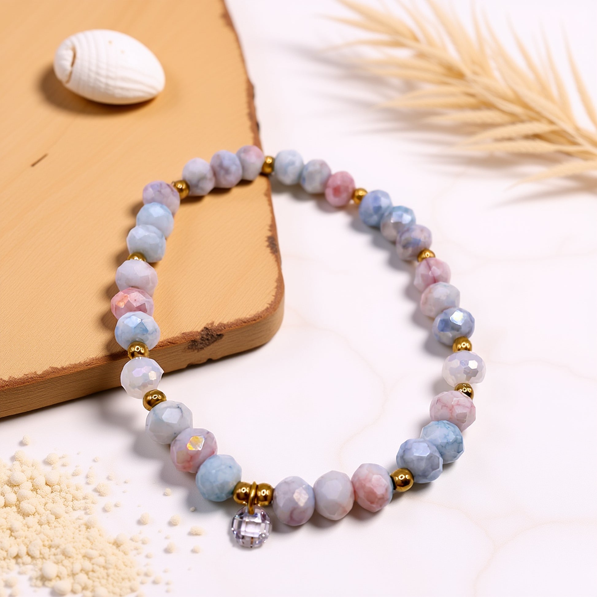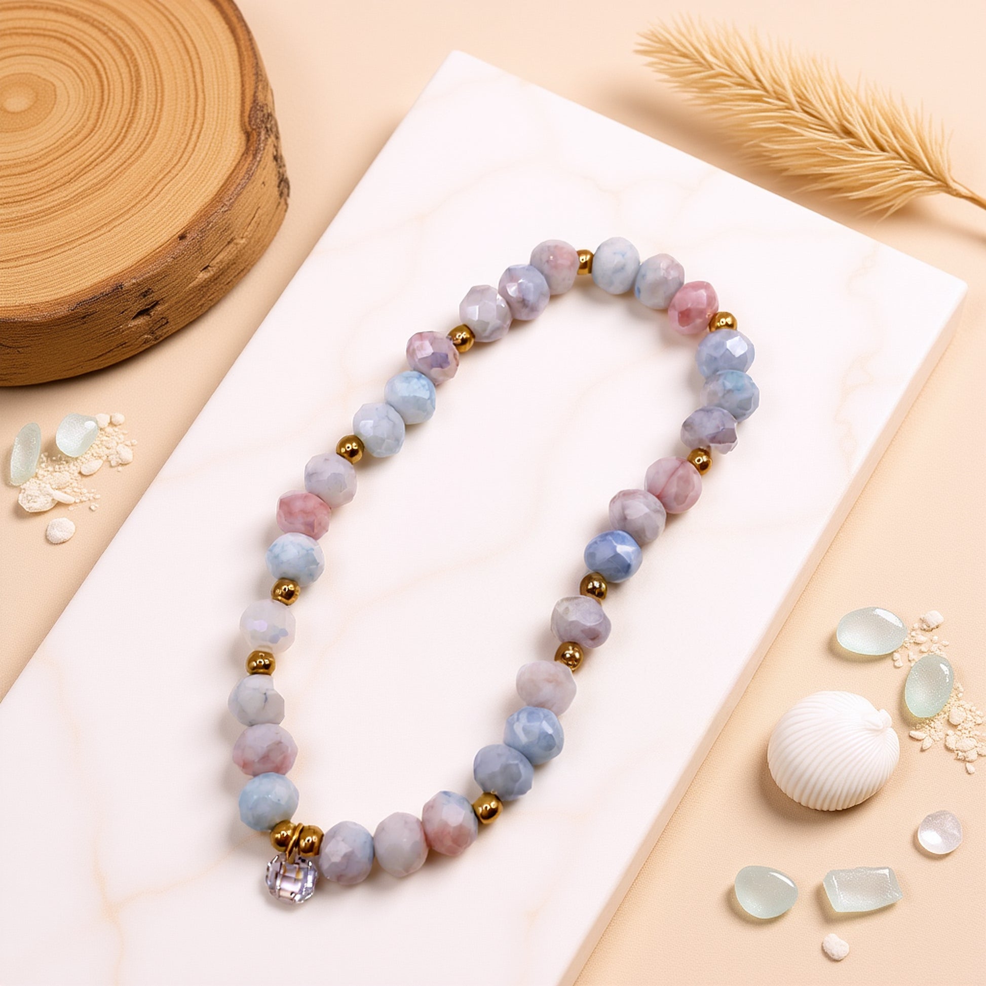 Bransoletka z niebieskimi kryształkami to elegancka i ręcznie robiona biżuteria dla kobiet, które kochają delikatny blask i subtelną kolorystykę. Fasetowane oponki w odcieniach błękitu i fioletu pięknie odbijają światło, tworząc wyjątkowy, mieniący się efekt. Drobne kuleczki złotego hematytu nadają całości elegancji i klasy, a centralna zawieszka z kryształkiem w oprawie ze stali chirurgicznej przyciąga spojrzenia niczym kropla porannej rosy.