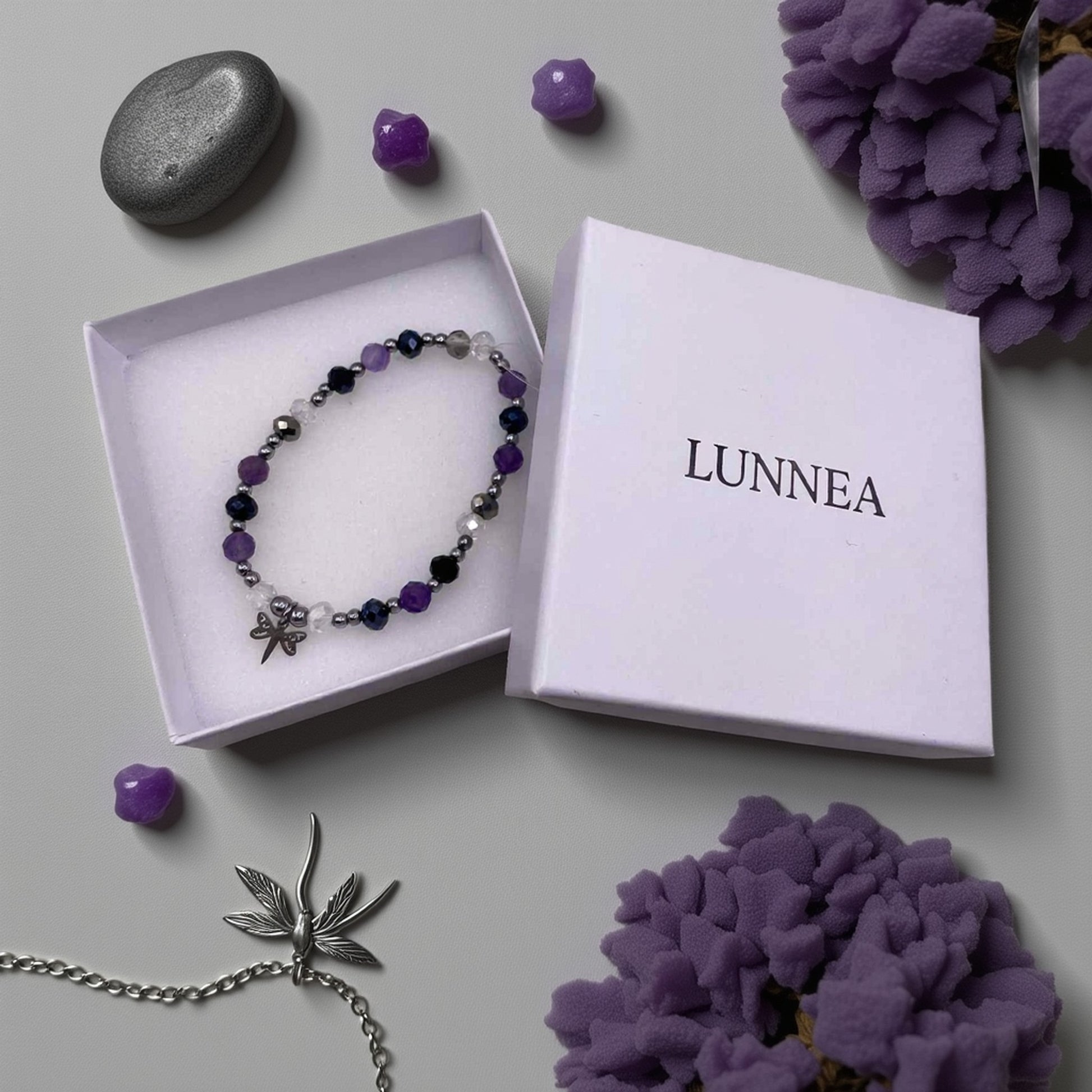 Ważka symbolizuje zmianę, wolność i siłę wewnętrzną – właśnie dlatego została umieszczona w centralnym punkcie tej bransoletki. Delikatne fioletowe odcienie ametystu koją zmysły, a hematyt dodaje stabilizacji i ochrony energetycznej. To doskonała bransoletka z kamieni naturalnych dla kobiet, które chcą żyć świadomie, w harmonii z naturą i sobą samą. Pasuje na prezent urodzinowy, imieninowy, z okazji awansu – lub po prostu jako znak wsparcia.