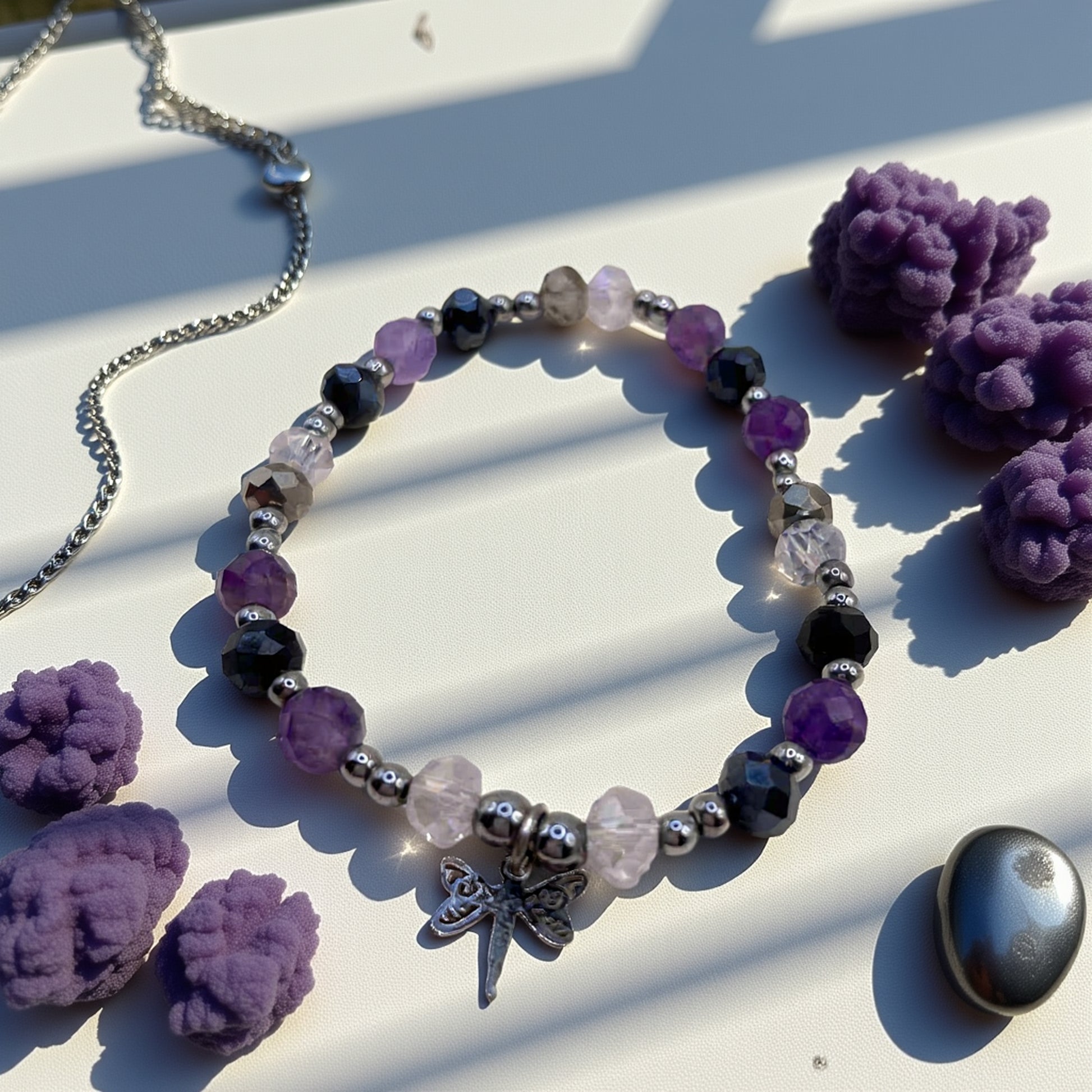 Wyjątkowa bransoletka z ametystem i zawieszką ważki to propozycja dla kobiet, które kochają połączenie magii kamieni naturalnych z nowoczesnym szlifem. Fioletowe kuleczki ametystu cudownie komponują się z opalizującymi oponkami ze szkła fasetowanego i srebrnymi kuleczkami hematytu. Centralnym akcentem jest zawieszka w kształcie ważki – symbol lekkości, transformacji i wewnętrznej siły. To idealna ręcznie robiona bransoletka na prezent dla przyjaciółki, siostry lub… samej siebie.