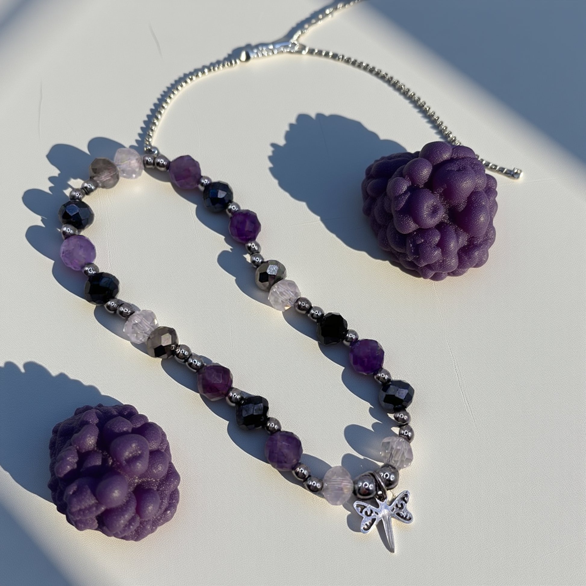 - Ametyst (fasetowane kule 6 mm) – kamień harmonii, duchowego rozwoju i intuicji.