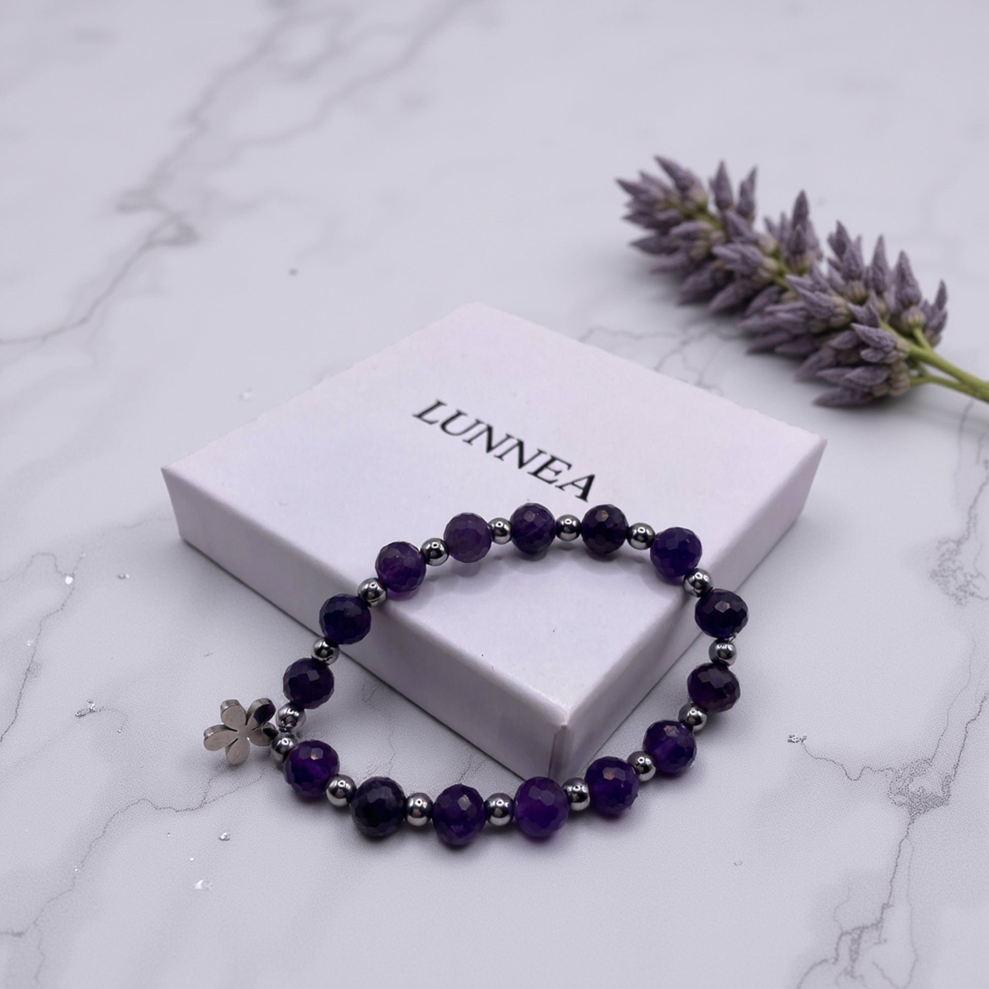 - Ametyst fasetowany 8 mm - kamień równowagi, spokoju i intuicji; jego szlif delikatnie odbija światło, nadając bransoletce blasku.