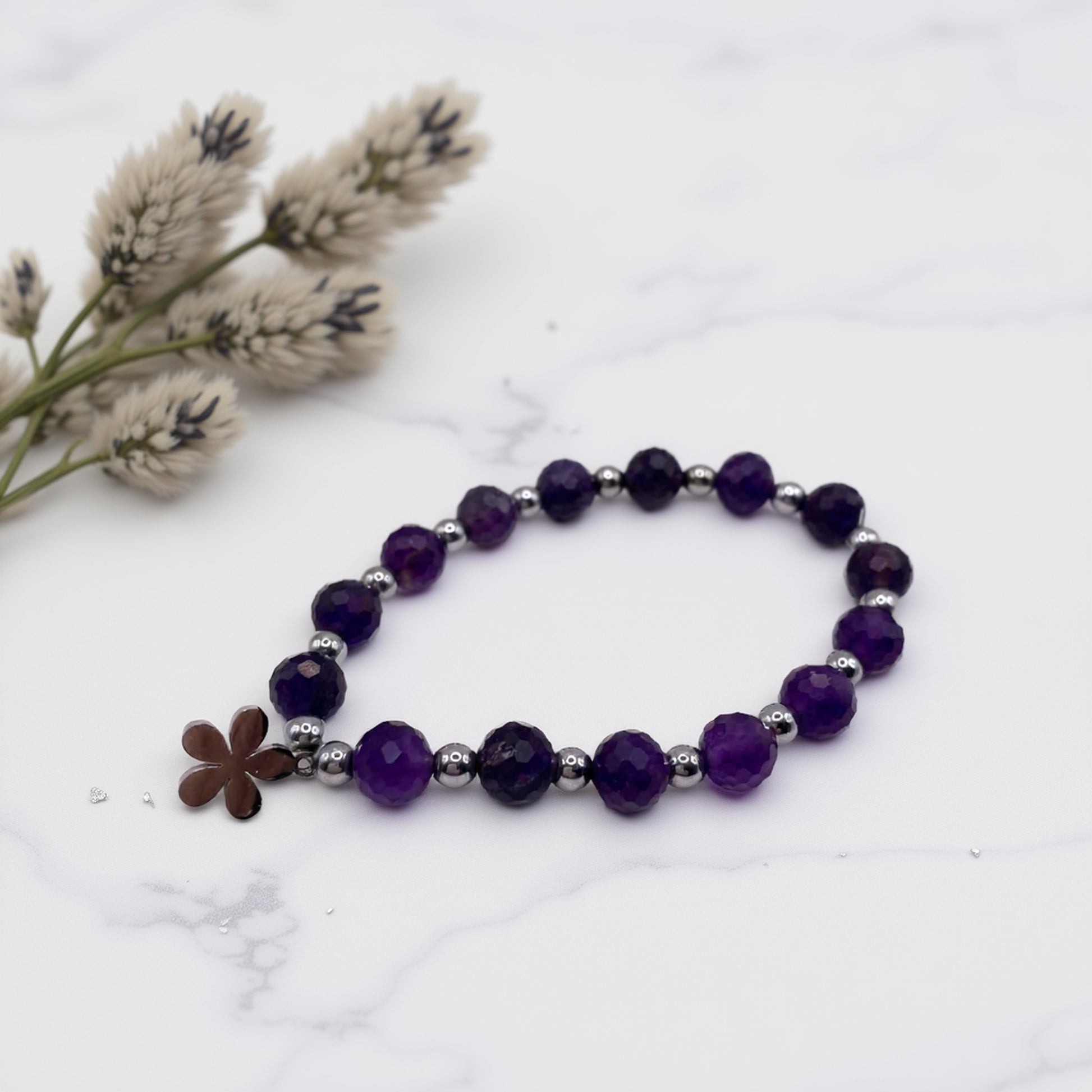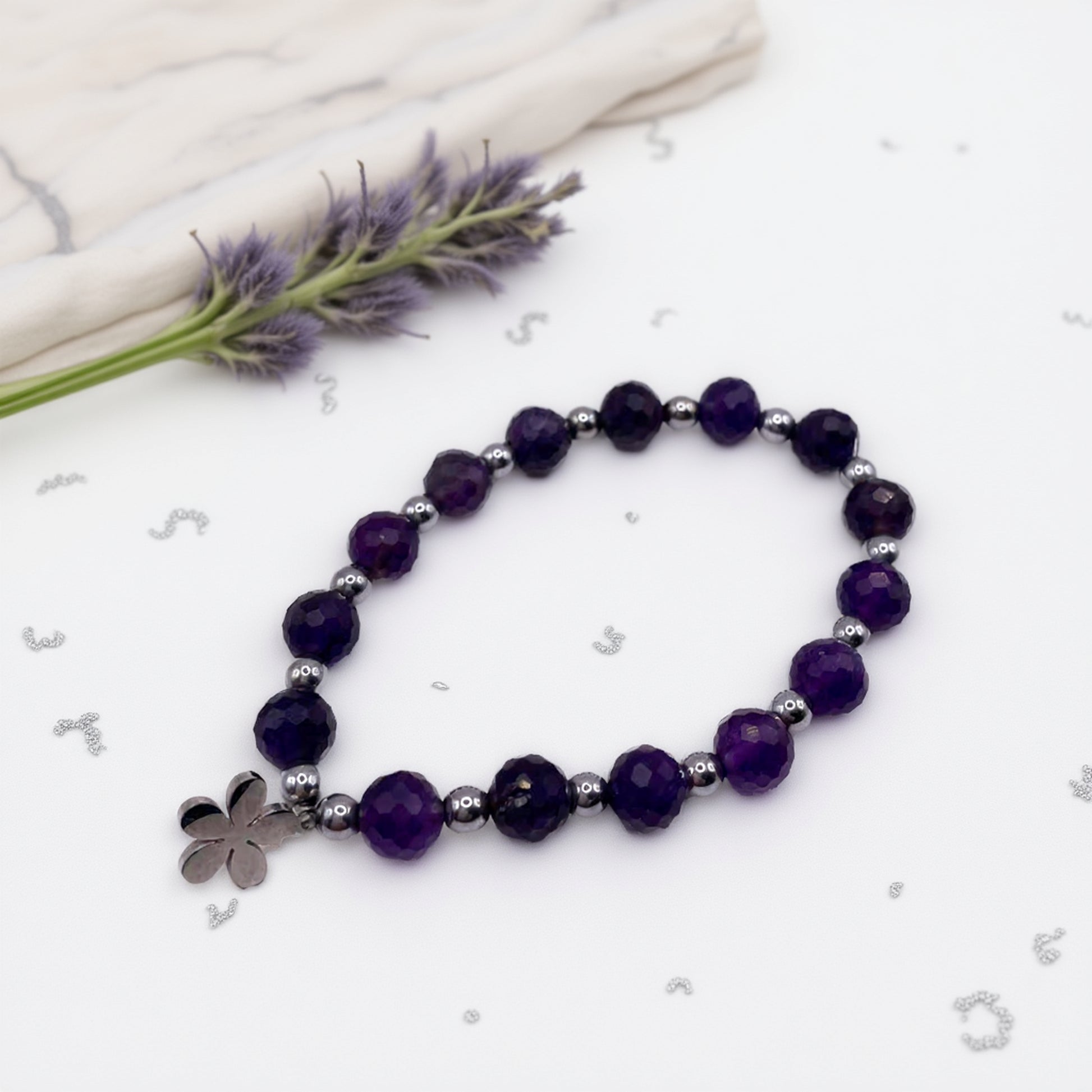 Zanurz się w magii fioletu – ta bransoletka z ametystem i hematytem to połączenie elegancji, spokoju i kobiecej delikatności. Wykonana ręcznie z fasetowanych kulek naturalnego ametystu oraz srebrzystych przekładek z hematytu, tworzy harmonijną kompozycję idealną na prezent - zarówno dla bliskiej osoby, jak i dla samej siebie. To nie tylko biżuteria handmade, ale również talizman niosący wewnętrzne ukojenie i pozytywną energię.