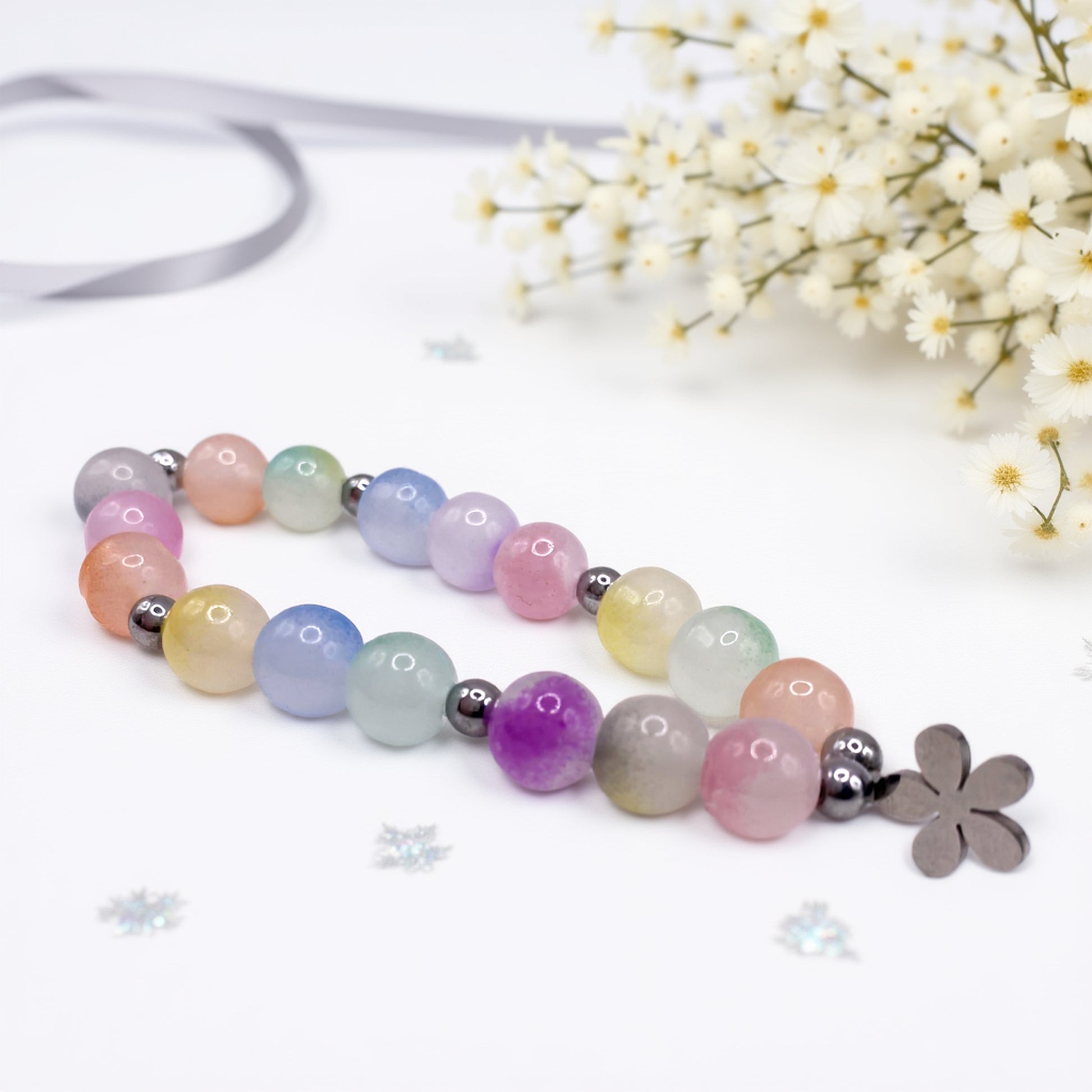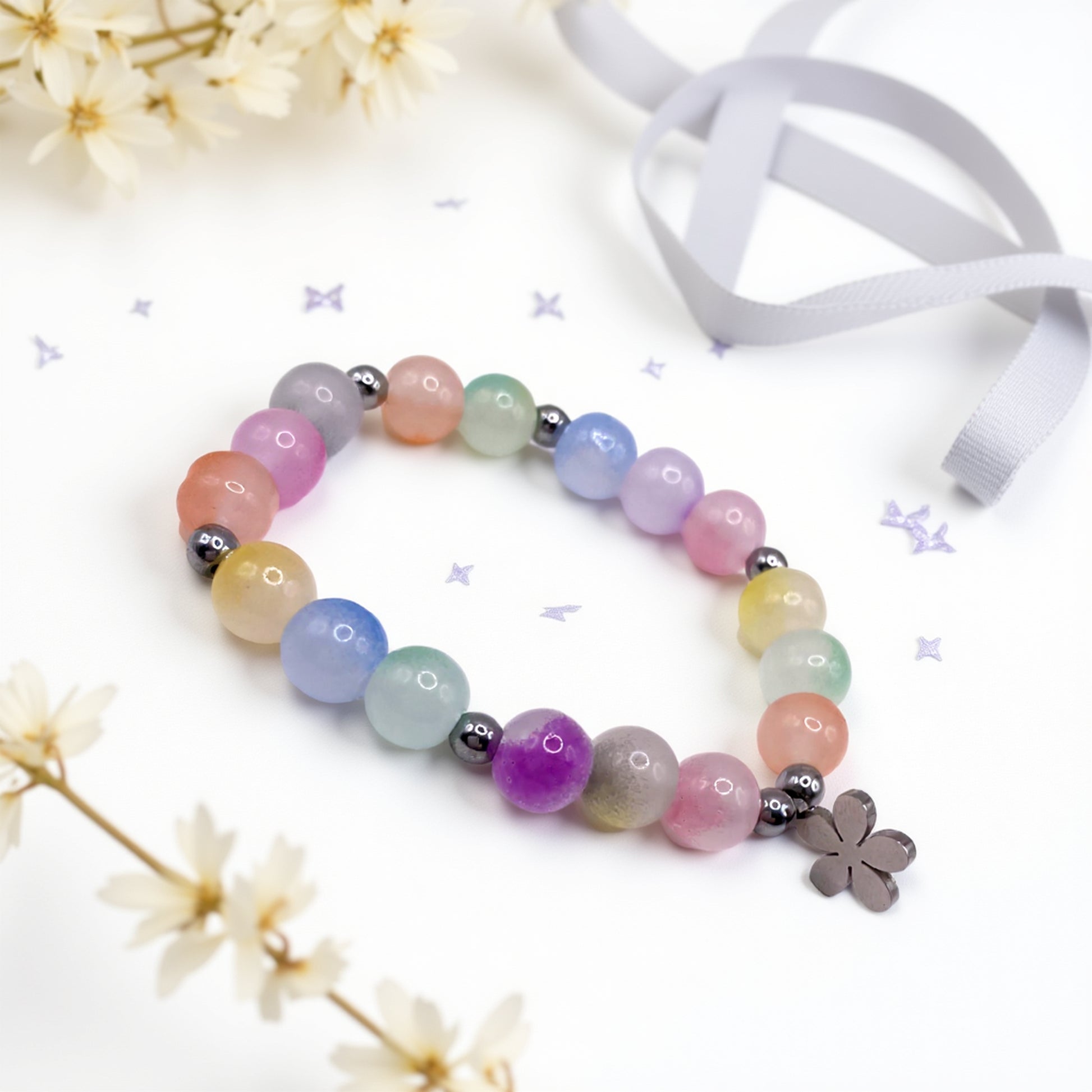 Ta kolorowa bransoletka to idealne połączenie delikatności, kobiecości i pozytywnej energii. Wykonana ręcznie z pastelowych, szklanych koralików oraz srebrnych kulek hematytu, przyciąga wzrok subtelnym blaskiem i radosnym zestawieniem kolorów. Uroku dodaje zawieszka z polerowanej stali szlachetnej w kształcie kwiatka - to symbol kobiecości, natury i świeżości. Doskonale sprawdzi się jako kolorowa bransoletka damska na prezent lub codzienny dodatek pełen lekkości.