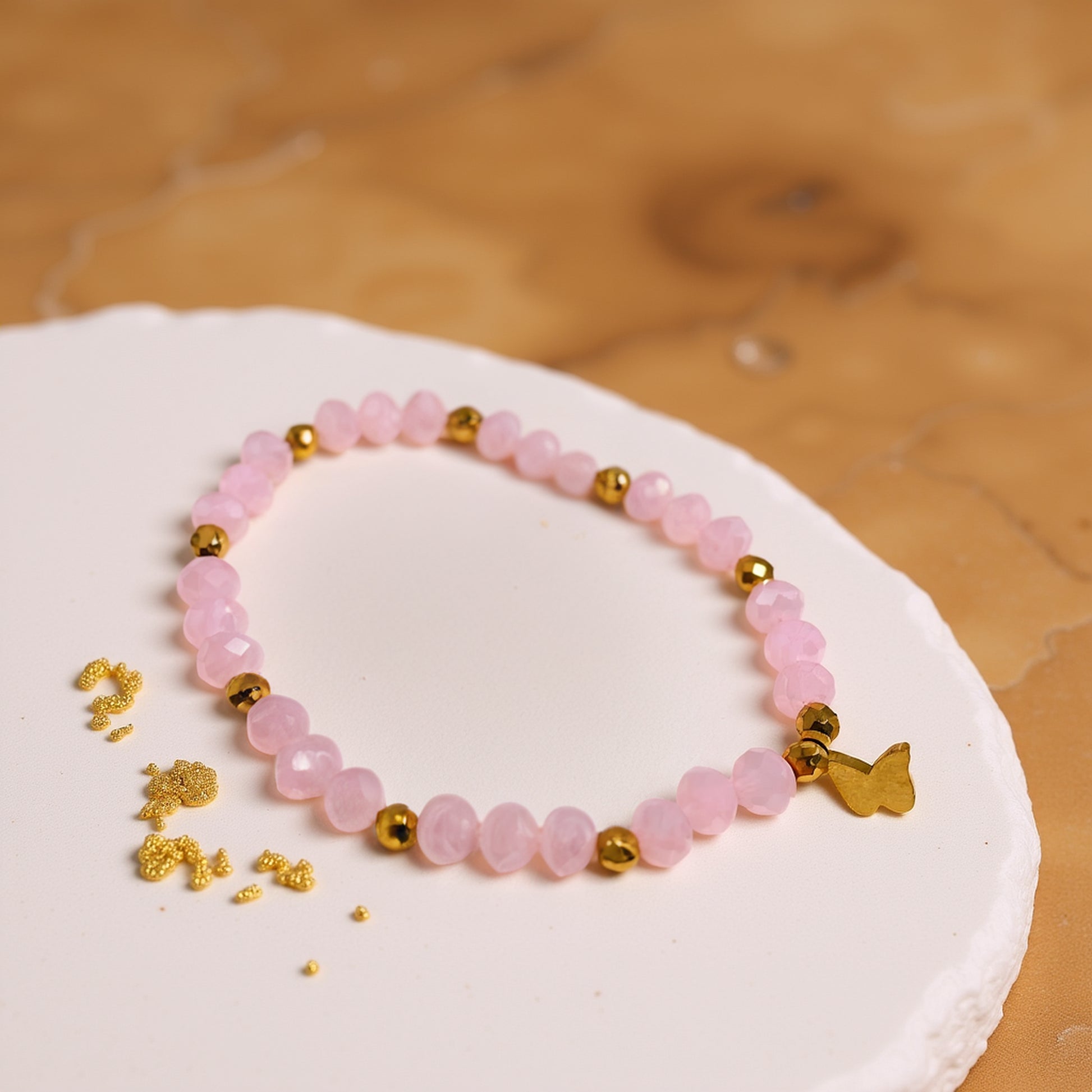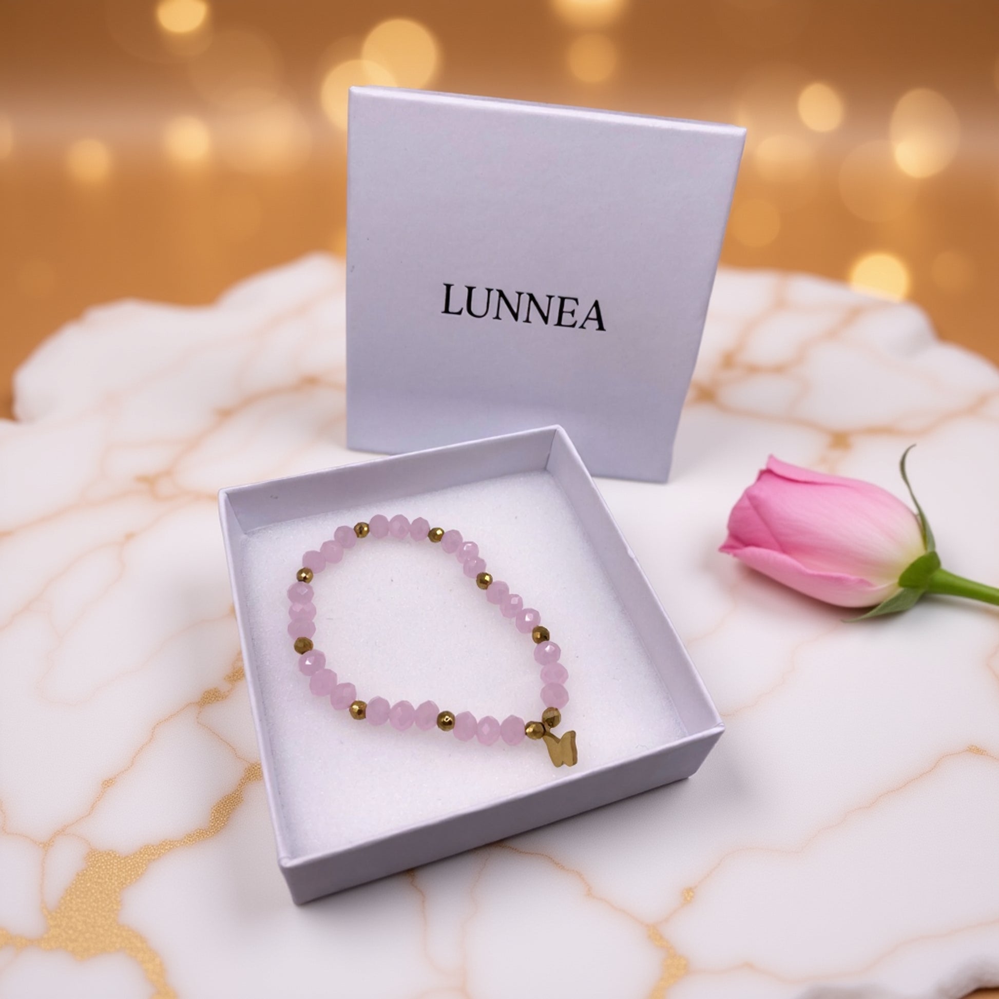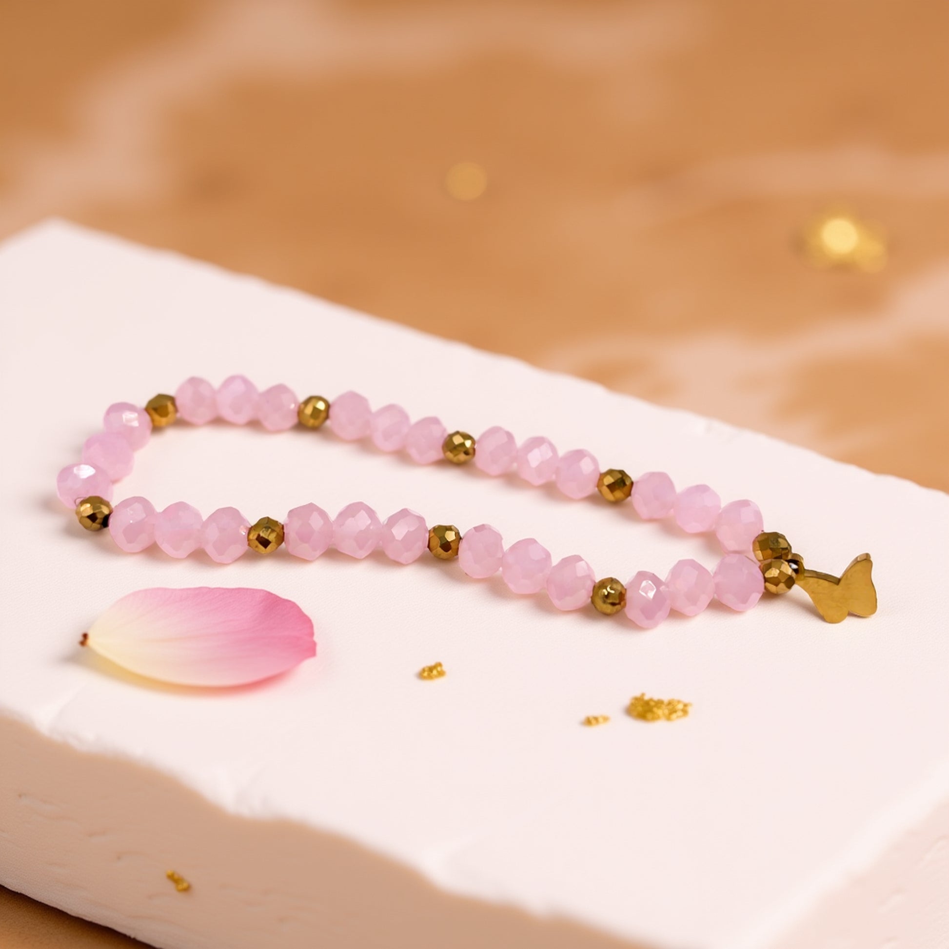 Stworzona z dbałością o detale, ta bransoletka z różowymi kryształkami i złotym motylkiem będzie pięknym uzupełnieniem każdej stylizacji - od romantycznych sukienek po casualowe zestawy. Szklane, fasetowane koraliki pięknie odbijają światło, a złote kuleczki hematytu dodają jej luksusowego charakteru. To unikatowa biżuteria handmade, którą pokochasz za kobiecy urok i wygodę noszenia.