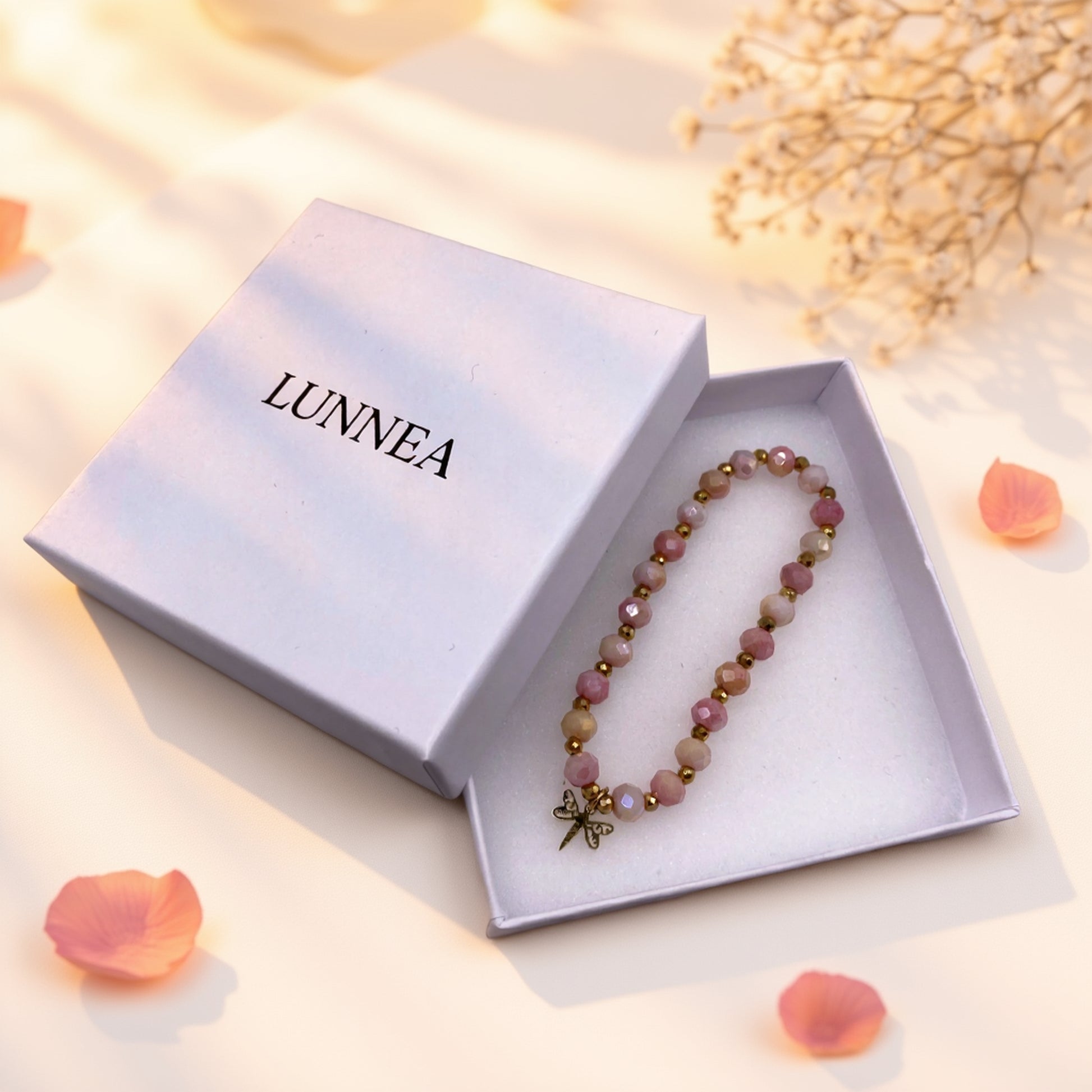 Ta bransoletka to prawdziwy hołd dla kobiecości – jej pastelowa kolorystyka przywołuje skojarzenia z romantycznym zachodem słońca, różanym ogrodem czy delikatnym ciepłem letniego wieczoru. Zawieszka w kształcie ważki dodaje lekkości, ale też głębi symbolicznej – to idealna propozycja dla kobiety, która przechodzi zmiany, rozwija się lub chce celebrować nowy etap w życiu.